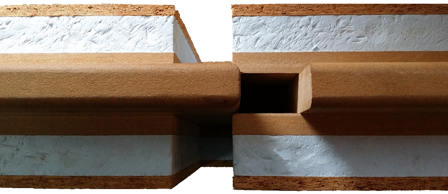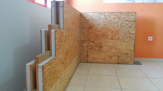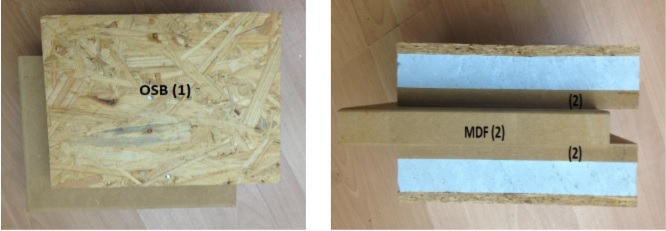 The MDF and OSB pieces with the extruded polystyrene in between are cut according to the dimensions using cutting machinery, whereas the pressing and gluing is done using special presses.