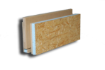 The invention regards a composite building element of MDF material (chipboard) which is placed in the centre and coated on both sides with panels of OSB (compressed wood pieces) with extruded polystyrene placed (XPS) midway.